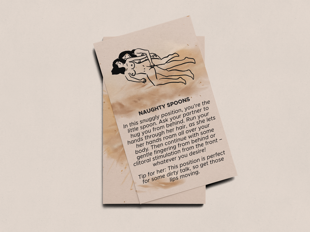 In this snuggly position, you’re the little spoon. Ask your partner to hug you from behind. Run your hands trough her hair, as she lets her hands roam all over your body. Then continue with some gentle fingering from behind or clitoral stimulation from the front – whatever you desire!
