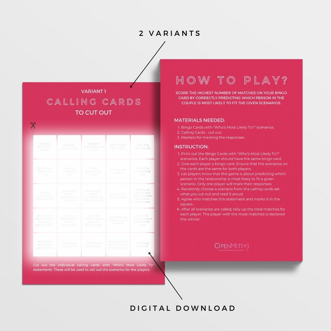 - There are two variants of bingo cards with "Who's Most Likely To?" scenarios.