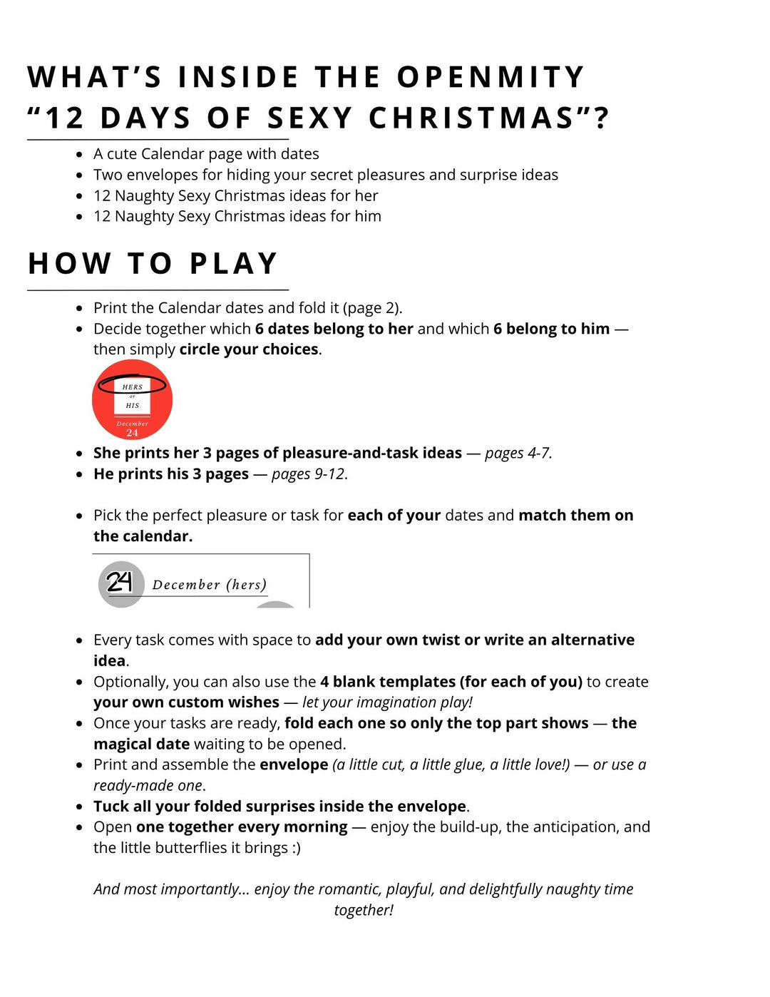 The 12 Days of Sexy Christmas is a printable adult Christmas calendar designed for couples who want to add romance, intimacy, and playful excitement to the holiday season.